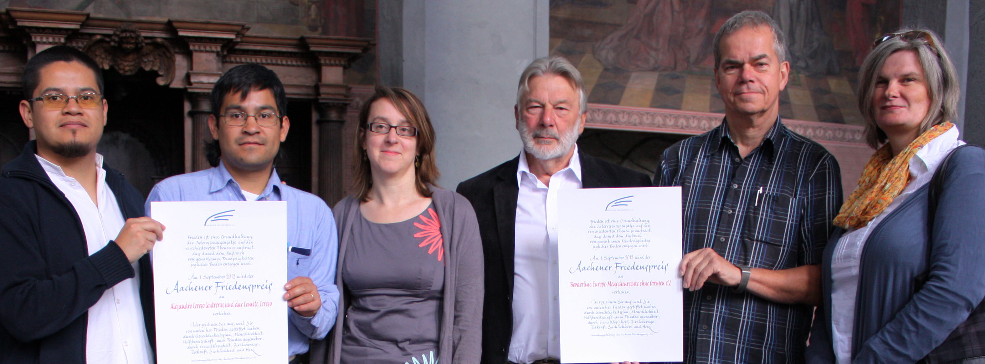 Zur Preisverleihung am Samstag, dem 1. September 2012, werden Alejandro Cerezo und einer seiner Brüder nach Aachen kommen, VertreterInnen von Borderline Europe natürlich auch. Um 17.30 Uhr wird auf der Kundgebung zum Antikriegstag am Aachener Elisenbrunnen unter anderem Stefan Schmidt sprechen, ehemaliger Kapitän der Cap Anamur und Gründungsmitglied von Borderline Europe. Von dort geht es mit einer Friedensdemonstration zur Aula Carolina, wo die Preisverleihung unter anderem mit Festredner Heribert Prantl aus München stattfindet, zu der alle Friedensfreundinnen und Freunde herzlich eingeladen sind. Wer mag, kann bis zum geselligen Ausklang im Anschluss an die Preisverleihung bleiben.